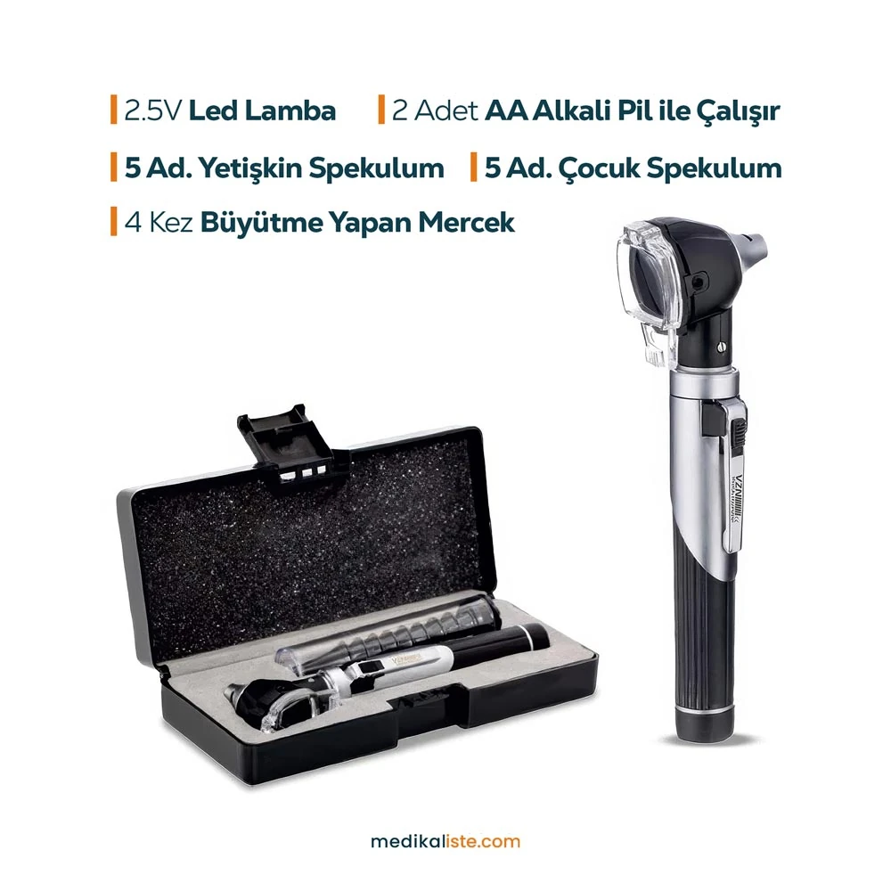 Optik Sistem: Otoskop kafası 4× büyütmeli ve döner mercekli olup, detaylı muayene imkanı sağlar.